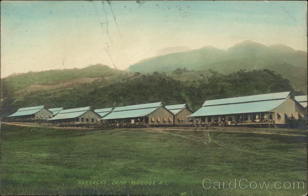Front: BARRACKS, CAMP ELDRIDGE PI. Back: pinil. Is e as DESCRIPTION - XD cop eldridae TRAVEL VELOX 今<令 XOP L STAMPL >> NJOX VELOX DISCARDED FROMOM ATOFBUSGS LUBLID LA AATLEBORO PUJUIC LIBRAK LIBRARY PICTURE COLL Mb 3