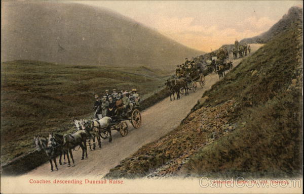 Front: Coaches descending Dunmail Raise. A braham's Series No. 436. Keswick, Back: 1/d. Id. THIS SPACE MAY BE USED FOR COMMUNICATION. THE ADRESS ONLY TO BE
