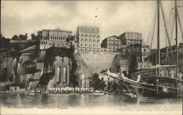 Front: GRAND HOTEL VITTORIA CRAN HOTEL LIFT EUR 8-A. SORRENTO - Grand Hôtel Vittoria. Back: CARTOLINA POSTALE ITALIANA (CARTE POSTALE D'ITALIE) A la Carte postale illustrée ANTONINO MARESCA SORRENTO Luigi de Maio, 5.