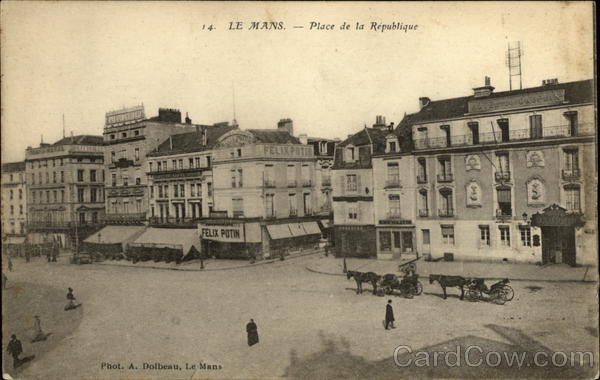 Front: LE MANS. - Place de la République 14. UVEL JUAUAUPHIN ALGRANDE PHA FELIXPOTIR SREARGABAS FELIX POTIN Phot. A. Dolbeau, Le Mans Back: CORRESPONDANGE Miss Cligen Satment Inside the city Miss Clige Patmand 75 d'an Buren Taunton Wlass uta.