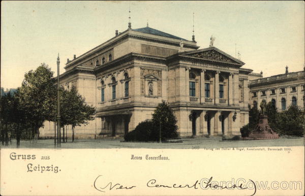 Front: 560 Verlag von Zedler & Vogel, Kunstanstalt, Darmstadt 1899. Gruss aus Neues Concerthaus. Leipzig. Craw Comcer house) reuw Back: Zum Aufkleben Freimarfe. An in. wohnung..... (Straße und Hausnummer)