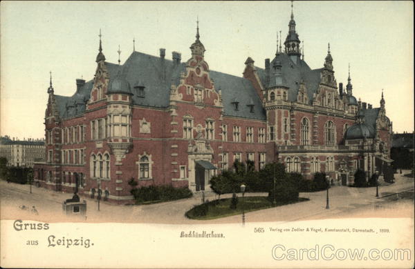 Front: Gruss Leipzig. 565 Verlag von Zedler & Vogel, Kunstanstalt, Darmstadt., 1899. Budihändlerhaus. aus Back: Zum Aufſleben Freimarke. 2n in. Wohnung.......... (Straße und Hausnummer)