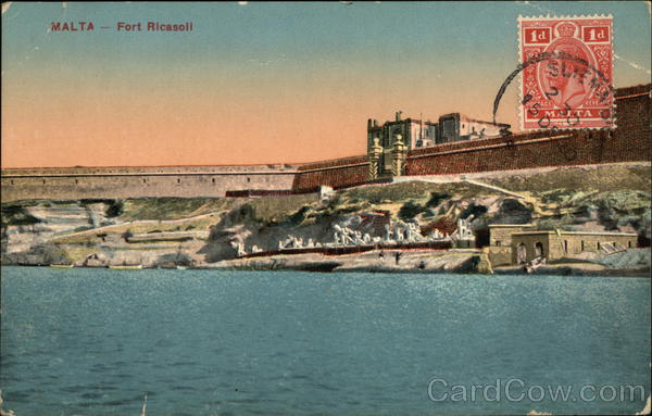 Front: MALTA Fort Ricasoli 1d 1d REVENE MALTA Back: Stampriowside . aus.Janio, igre Giovanni fammud 54 strada Britannica Valluta, Malta USCE8353 m . Lei รจ italiano? F. J. Valente Mansfield Mass., U.S.A.