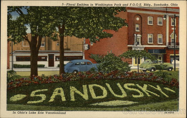 Front: 3-Floral Emblem in Washington Park and F.O.O.E. Bldg., Sandusky, Ohio 1110 7HE EC0 SANDUSKY In Ohio's Lake Erie Vacationland 4 B-H978 Back: E. B. ACKLEY, SANDUSKY, OHIO