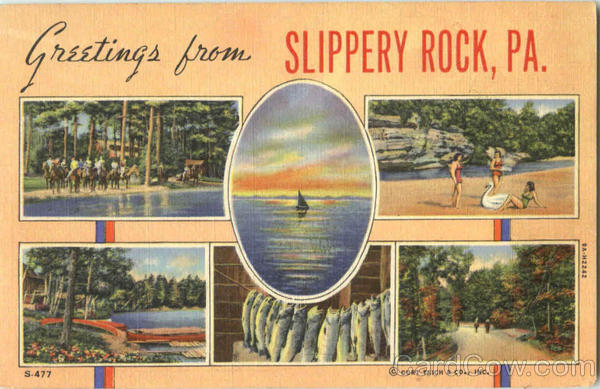 Front: Grestings from SLIPPERY ROCK, PA. S.477 CURT TEICH & CO., INC. BA-H2242 Back: C. T. GREETINGS10 SUBJECTS