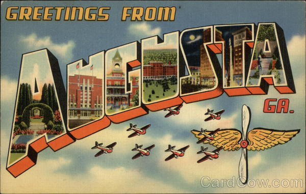 Front: GREETINGS FROM GA. Back: 30 14225 A 'COLOUR PICTURE'' PUBLICATION, CAMBRIDGE, MASS., U. S. A. AUGUSTA, GA. PUB. BY AUGUSTA NEWS CO.