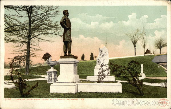 Front: 9176. TOMB OF JEFFERSON DAVIS, HOLLYWOOD, RICHMOND, VA. COPYRIGHT 1905. BY DETROIT PUBLISHING CO. Back: "PHOSTINT" CARD, MADE ONLY BY DETROIT PUBLISHING CO. THIS SPACE MAY BE USED FOR MESSAGE. AND CANADA. FOREIGN. TWO CENTS