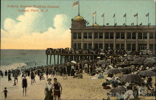Front: Asbury Avenue Bathing Ground, Asbury Park, N. J. 1.11 Back: 21073-PUB. BY BECHTEL AND KOCH, ASBURY PARK, N. J. Domestic and Two Cents