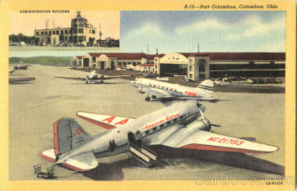 Front: ADMINISTRATION BUILDING A-15-Port Columbus, Columbus, Ohio American 7Airdines NC21793 6B-H1322 Back: W. E. AYRES, 1049 LIVINGSTON AVE., COLUMBUS, OHIO