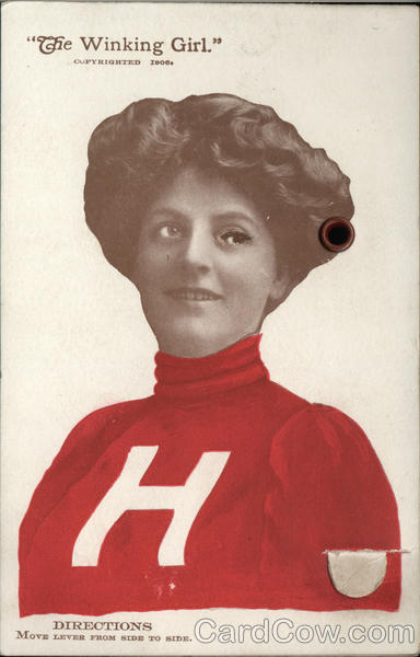 Front: "The Winking Girl." COPYRIGHTED 1906. DIRECTIONS MOVE LEVER FROM SIDE TO SIDE. A Back: PORTLAND, ME, CO, Made for H, C, LEIGHTON The HAVILAND MECHANICAL POST CARD Patent Pending All Rights Reserved 20-
