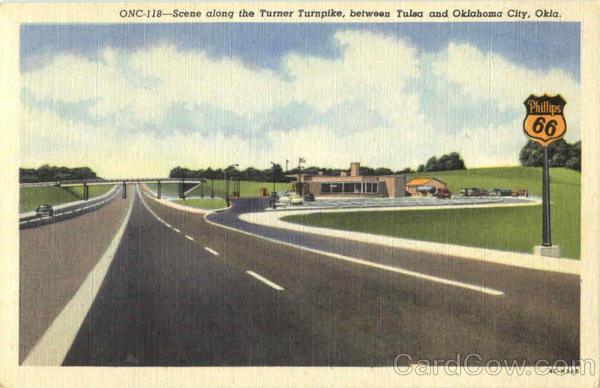 Front: ONC-118-Scene along the Turner Turnpike, between Tulsa and Oklahoma City, Okla. Philips 66 4C-H345 Back: OKLAHOMA NEWS CO., TULSA, OKLA.