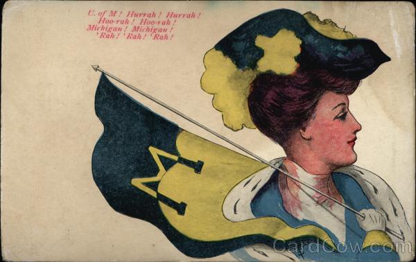 Front: U. of M! Hurrah! Hurrah! Hoo-rah! Hoo-rah! Michigan! Michigan ! Rah! 'Rah! 'Rah! (69 \/ Back: Douglass Post-Card Co., 27 N. 10th St., Philadelphia, Pa. Post Carde Qey 3.00 Le- TWO CENTS
