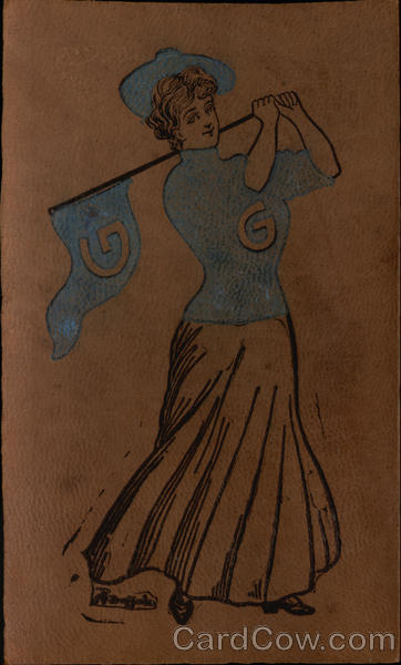 Girl and pennant with blue and white school colors.