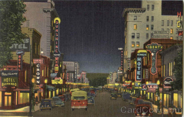 Front: De PAULS क्ानाब ES OTEL FIRST VE HEATR KINGS DIANONDS WATCHES ALVAR ADO CocaCo CH CLEEE 1BER AUTAA AFE FRERT SSMSHINE CROWN POTUS Back: ALBUQUERQUE, N. MEX. LOOKING WEST BY NIGHT A-50CENTRAL AVE., OB-HI292