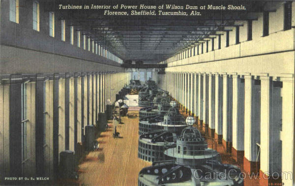 Front: Turbines in Interior of Power House of Wilson Dam at Muscle Shoals, Florence, Sheffield, Tuscumbia, Ala. PHOTO BY o. S. WELCH Back: ANDERSON NEWS COMPANY, FLORENCE, ALA.