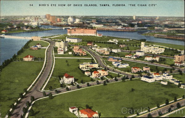 Front: 94 BIRD S EYE VIEW OF DAVIS ISLANDS, TAMPA, FLORIDA. "THE CIGAR CITY" Cray! Back: E-8308 Published by Hartman Card Co. Pinellas Park, Florida