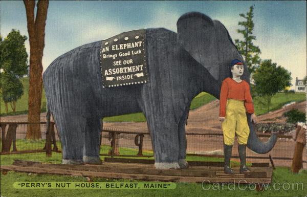 | Front has a picture of a statue of an elephant, wearing a blanket with the legend "An Elephant Brings Good Luck / See our Assortment Inside," and its handler. Back: Perry's Tropical Nut House, Inc. / Belfast, Me. and Seabrook, N.H. / "A Place Worth Visiting" / A solid, wooden, life-size replica of an Indian elephant. This, and over a hundred other exhibits to see, Admission FREE. A "Most Interesting Place on the Main Coast". Visitors are always "WELCOME". |
