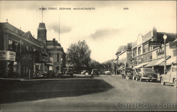 Front: MALN STREET, DEDHAM, MASSACHUSETTS 6929 TOUR TIO TEELANS Back: 204 PHOTOLUX AMERICAN ART POSTCARD CO., BOSTON, MASS. HASS,
