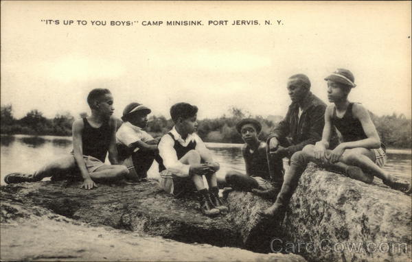 Front: "IT'S UP TO YOU BOYS!" CAMP MINISINK, PORT JERVIS, N. Y. Back: JUN 19 1941 21 ARtvue 226 FIFTH AVE., NEW YORK, N. Y.