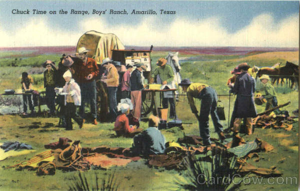 Front: Chuck Time on the Range, Boys' Ranch, Amarillo, Texas Back: Chuck from a regular Chuck Wagon, something every boy dreains of. K 1109 SOLD BY WEST TEXAS NEWS AGENCY, AMARILLO, TEXAS A-COLOURPICTURE PUBLICATION BOSTON 15. MASS.. US A.