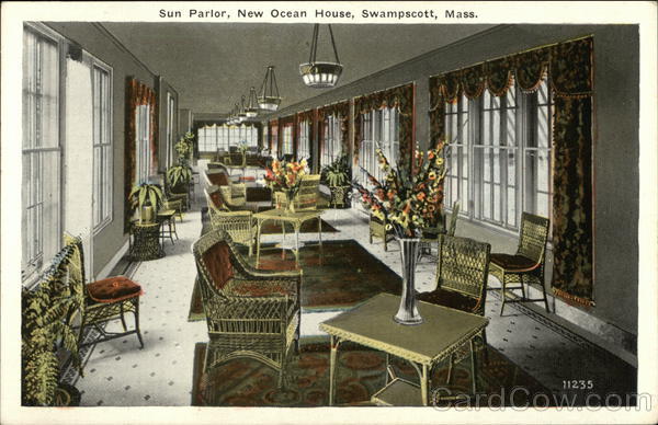 Front: Sun Parlor, New Ocean House, Swampscott, Mass. 11235 Back: Pub. by The Puritan Drug Shop. Swampscott, Mass. 3. Made in U. 8. A. Place the Stamphere and Island Possessions Cuba,Canada and for foreign.