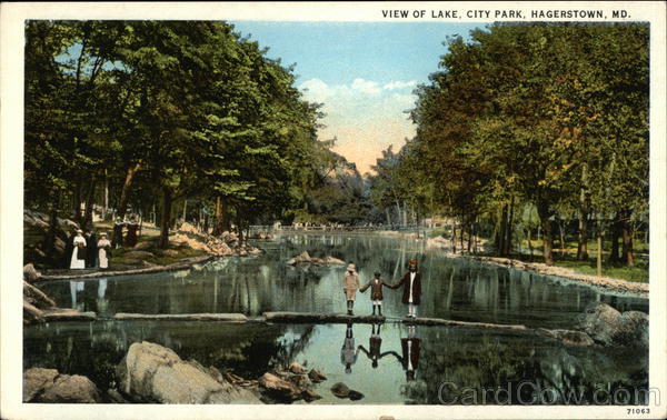 Front: VIEW OF LAKE, CITY PARK, HAGERSTOWN, MD. WW 71063 Back: MADE IN USA PUBLISHED BY LOUIS KAUFMANN & SONS, BALTIMORE, MD, L.K&Sons Baltimore. C. T. AMERICAN ART COLORED 8- HERE