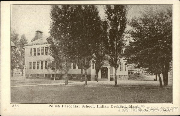 Front: 834 II FULL 45 110 MU RI Polish Parochial School, Indian Orchard, Mass. Pub. by. "A. E. Booth" Back: 32 Union Square N Y Inc. Co The Greeting Card Mfg.