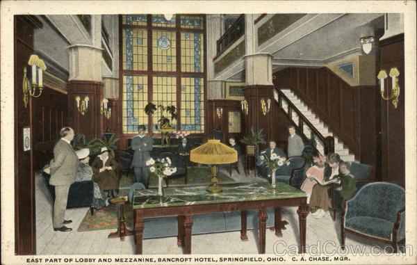 EAST PART OF LOBBY AND MEZZANINE, BANCROFT HOTEL, SPRINGFIELD, OHIO. C. A. CHASE, MGR.