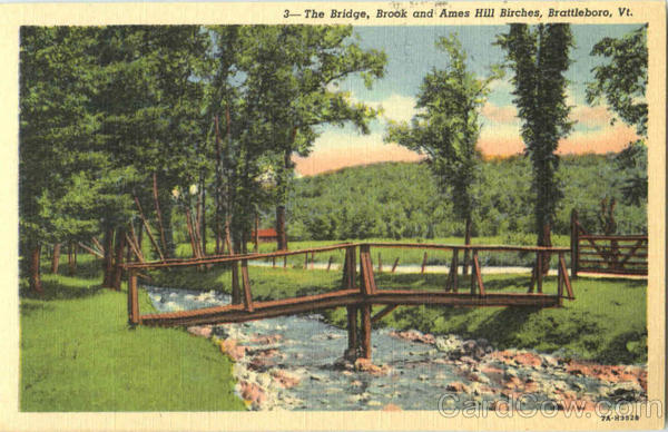 Front: 3- The Bridge, Brook and Ames Hill Birches, Brattleboro, Vt. 7A-H3526 Back: BAKER'S, BRATTLEBORO, VT.