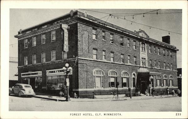 Front: 20 13- LU 100 FOREST FOTEL CORAZ CORNE 11 111 FOREST HOTEL, ELY, MINNESOTA. 233 Back: PHOTO-CHROME BY W A. FISHER CO., VIRIGINIA, MINN.