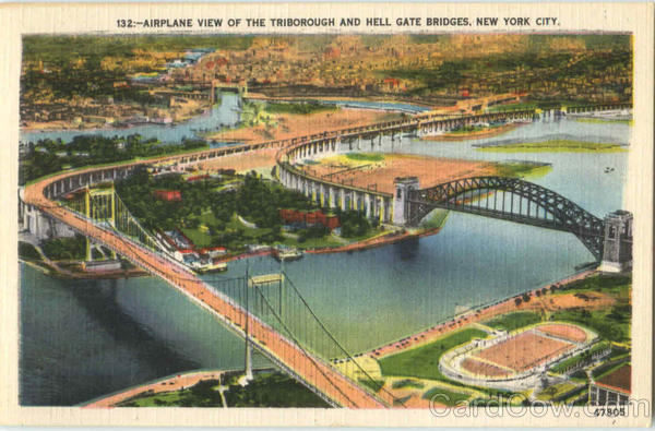 132:-AIRPLANE VIEW OF THE TRIBOROUGH AND HELL GATE BRIDGES, NEW YORK CITY.