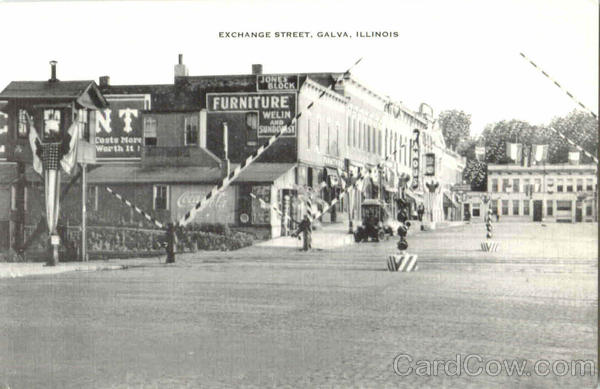 Front: EXCHANGE STREET, GALVA, ILLINOIS JONES BLOCK FURNITURE INT WELIN SUNDOWAST Costs More Worth It Coca' VI 士1 Back: 22949N MADE IN USA DYE C KROPP CO., MILWAUKEE (RCA)