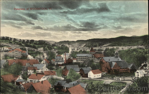 Front: Panorama of WOODSTOCK, Vt. BEE TOOT Back: Published by Woodstock Pharmacy, W. D. Clough, Prop. A M. 8. 213 This Space is for Address only
