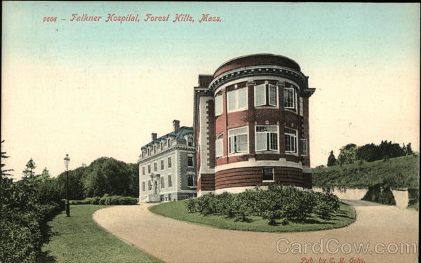 Front: 9666 Falkner Hospital, Forest Hills, Mass. Pub. by C. G. Ochs. Back: Pub. by Robbins Bros, Boston, Mass. and Germany 7.PM MAL OUNDING Ar. Fried Arad Hill. A. G RATUITRESIDUE OF JAMESTOWN AMERICA D'S 1580-CAPT.JOHN SMITH-1631 1607