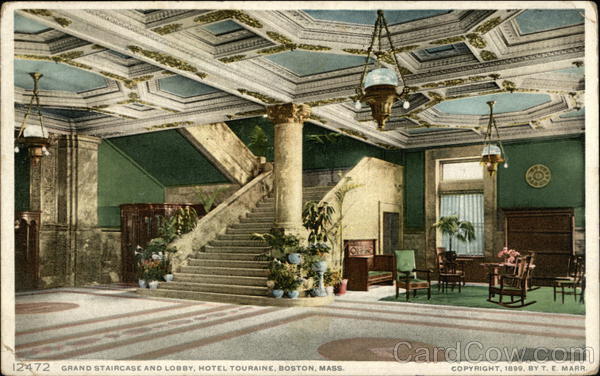 GRAND STAIRCASE AND LOBBY, HOTEL TOURAINE, BOSTON, MASS.