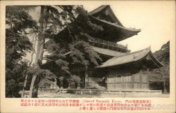 Front: 再古巾りな基開の師國明大山宗濟臨 (Gateof Nanzenji. Kyoto. 門山寺輝南都京) 成建再りに災火亦間年治明堂本殿佛がしせ復に觀書り成建再間年錄 り櫂に火兵度 ふ傳と虎しせ攘隠の門衛右五川石昔は門山りれ Back: きかは復郵