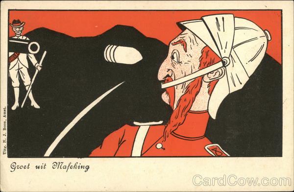 Front: Uitg. N. J. Boon, Amst. Groet uit Mafeking ادا کر t Back: BRIEFKAART. (CARTE POSTALE) ALGEMEENE POSTVEREENIGING (UNION POSTALE UNIVERSELLE) Zijde voor het adres bestemd. (Coté réservé à l'adresse)