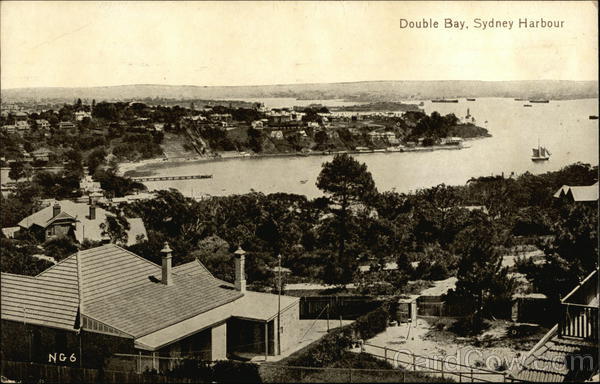 Front: NG 6 Ca Double Bay, Sydney Harbour 366. Back: The Valentine & Sons Publishing Co., Ltd., Sydney This space may be used for communication: Best wishes Nelna Де деле 31/7/19