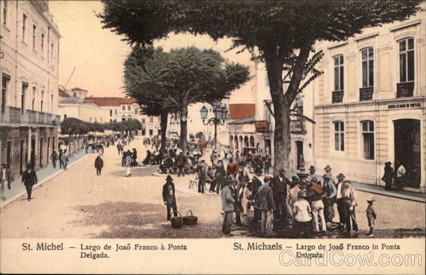 Front: St. Michel Largo de Joao Franco à Ponta Delgada. IN St. Michaels CAN BANKS AGENCIA DO Largo de Joao Franco in Ponta Delgada. Back: Bilhete Postal Portugal e Hespanha 10 reis Estrangeiro 20 reis Étranger-Foreign countries 20 reis