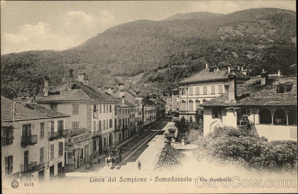 Front: 3221 DIE S 的著 Linea del Sempione - Domodossola Via Garibaldi. Back: CARTOLINA POSTALE ITALIANA (CARTE POSTALE d'ITALIE) Edit. Brunner & C., Como-Zürich - Stab. eliografico.