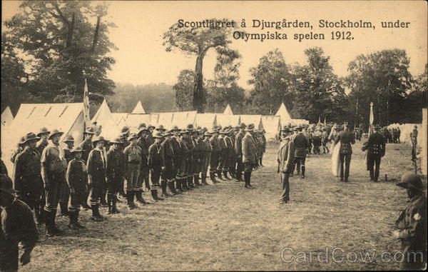 Front: Scoutlägret å Djurgården, Stockholm, under Olympiska spelen 1912. Back: ENS LITOGRAFISKA AB STOCK HOLM Porto: Lokal. 2 öre Inrikes 4 öre Utrikes 5 öre då afsändaren endast skrifver namno. adress. Eljest som Brefkort.