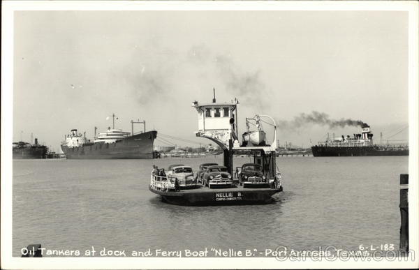 Front: NELLE B LOW CLEARANCE CARS ONLY NELLIE B. CORPUS CHRISTI TEX. 6-L-183 Oil Tankers at dock and Ferry Boat "Nellie B." - Port Aransas, Texas. Back: r-Kodak Paper