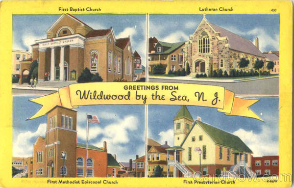 Front: First Baptist Church Lutheran Church 400 RRIE ATIET CHURCH GREETINGS FROM Wildwood by the Sea, N. J. First Methodist Episcopal Church First Presbyterian Church K4679 Back: A-COLOUR PICTURE PUBLICATION BOSTON 15 MASS, USA