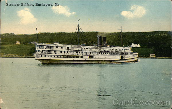 Front: Steamer Belfast, Bucksport, Me. VAST 1111 ELFEST Back: 1909 Pub. by W. T. Hill, Bucksport, Me. SUBS, ARROW, ARGUS PEN DOST Ines E., Inov E.. Know Clow Passadum umising re