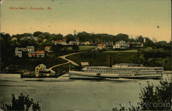 Front: Waterfront, Hampden, Me. CITT POCELAND: #1 Back: Published by J. Myrick. Box 16 N.N. 56/1 1256 Mrs что Ruth M. ledley Hampden чи Highlands Maine Far Address 0 Mt. 50 μον FRANKLIN 190 1706 ONE CENT) Miss Anle Brownr Belfast Mainh