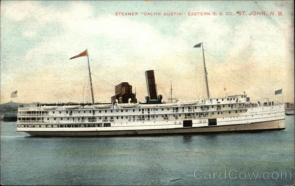Front: 013 STEAMER "CALVIN AUSTIN" EASTERN S. s. co. ST. JOHN, N. B. LAS STEPSHI COYPAN* Back: Montreal Import Co., Montreal No. 944 Writing Space. Name and Address.
