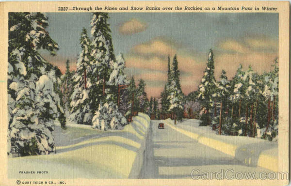 Front: 2027-Through the Pines and Snow Banks over the Rockies on a Mountain Pass in Winter FRASHER PHOTO CURT TEICH a co., INC. Back: "*c. T. ART.COLORTONE," SANBORN SOUVENIR CO., DENVER, COLO. 2891:00 RERE