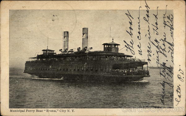 Front: Municipal Ferry Boat Bronx," City N. Y. day me in last ht. Had ik The boat. ис ut comme ·late. P.D. will white Back: 1905-1941 HARB INERI SEP Post Card 24 06 Mr Chos. Post. Kenda daia SERIEN NITED S affh 1706 FRANKLIN 1790 ny.