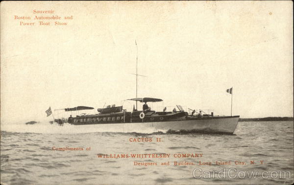 Front: Souvenir Boston Automobile and Power Boat Show Compliments of EREBY O 00 CACTUS II. WILLIAMS-WHITTELSEY COMPANY Designers and Builders, Long Island City, N. Y Back: TWO CENTS