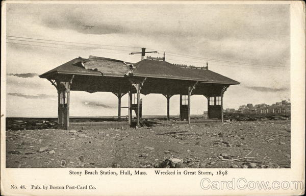 Front: Stony Beach Station, Hull, Mass. No. 48. Pub. by Boston Post-Card Co. Wrecked in Great Storm, 1898 mich Label Back: TWO CENTS